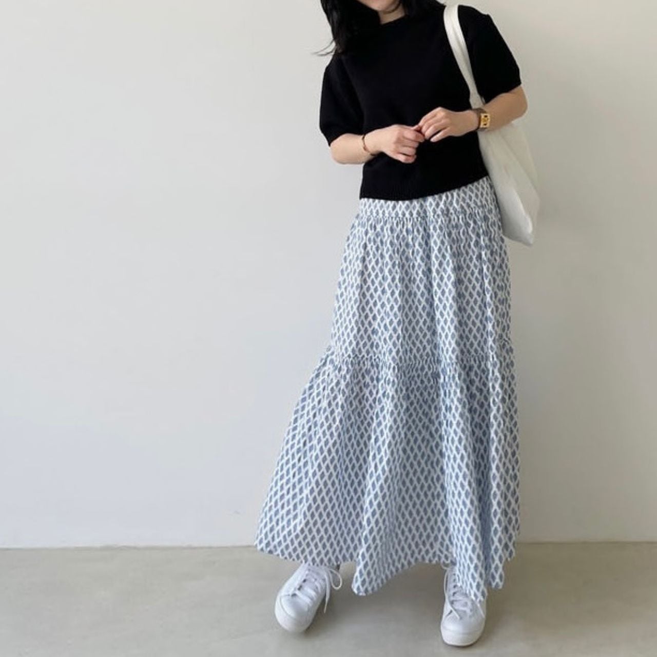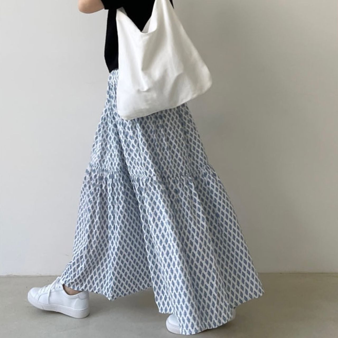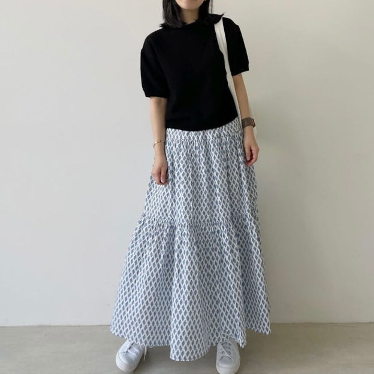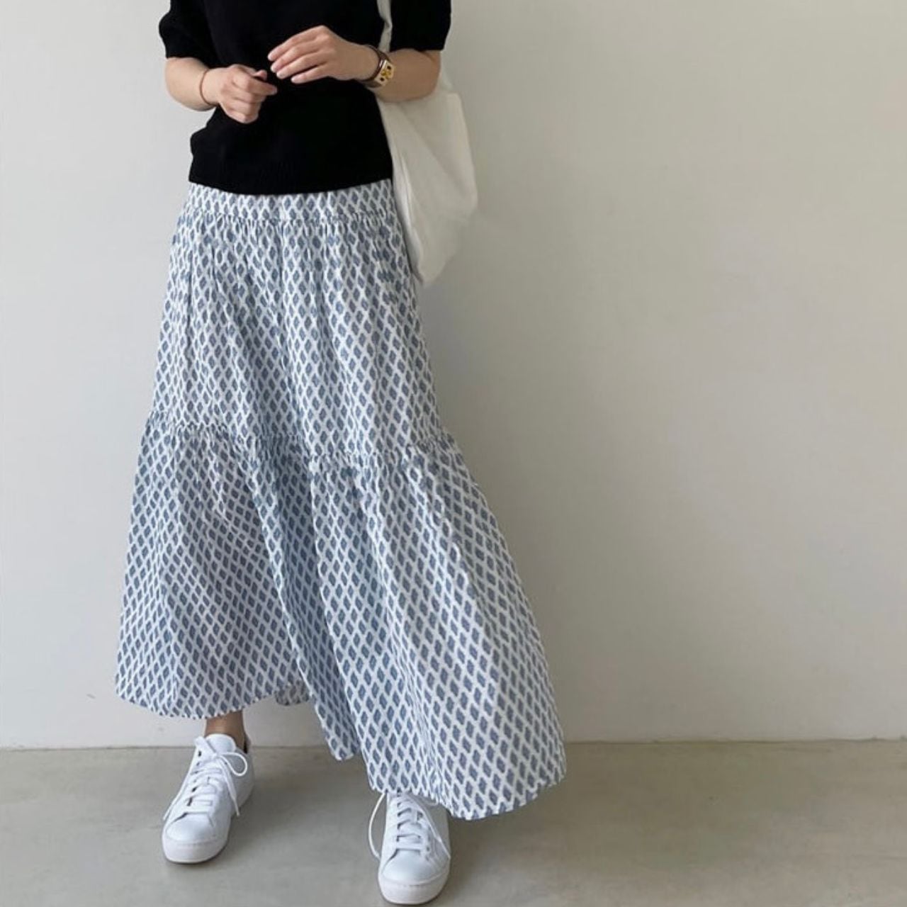 ウエストゴム仕様で楽な着心地のロング丈スカート。