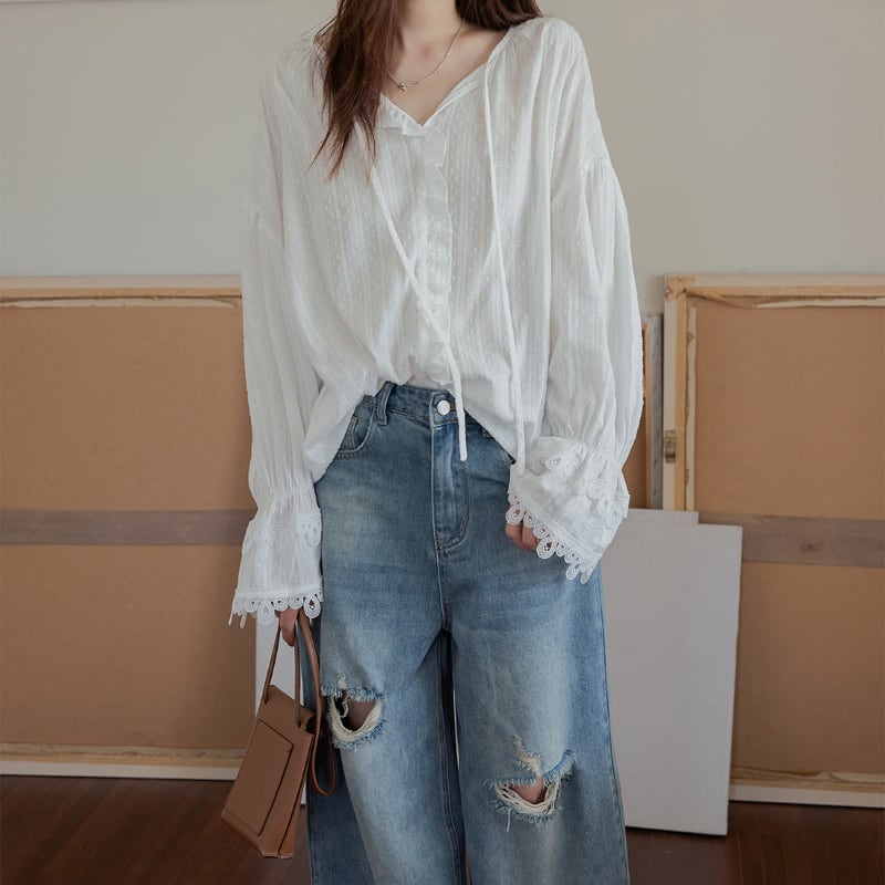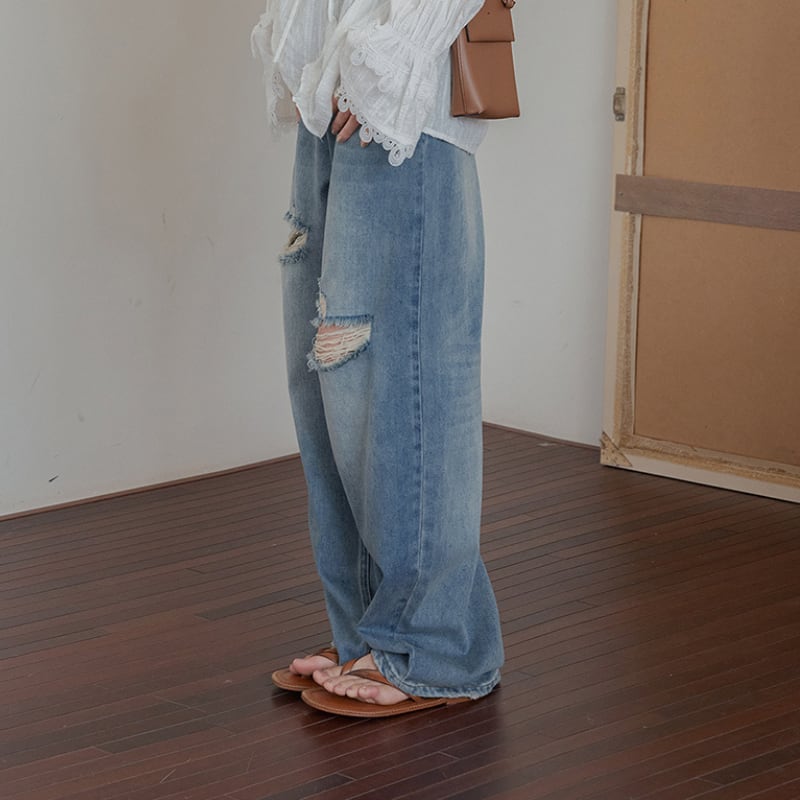 トレンド感たっぷりのダメージデニムワイドパンツ。