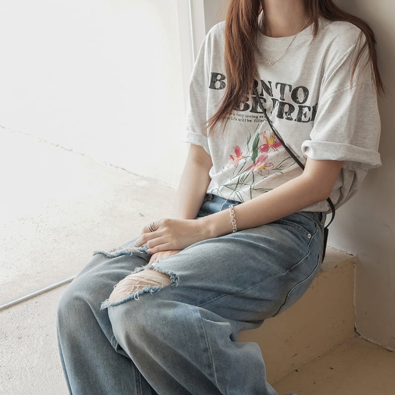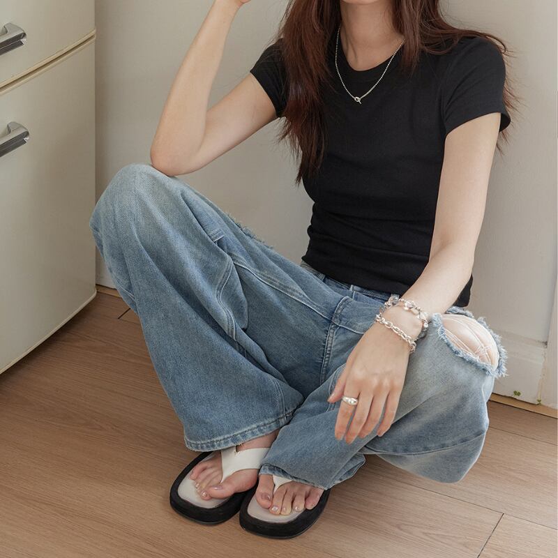 膝部分のダメージ加工が、シンプルながらも個性を引き立てます。