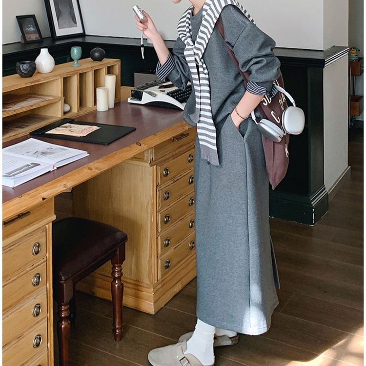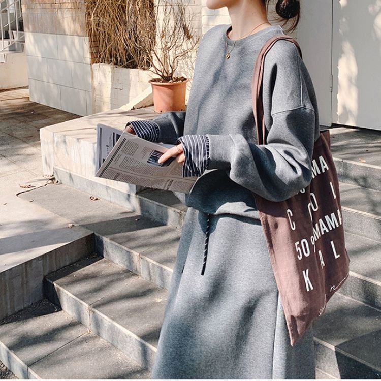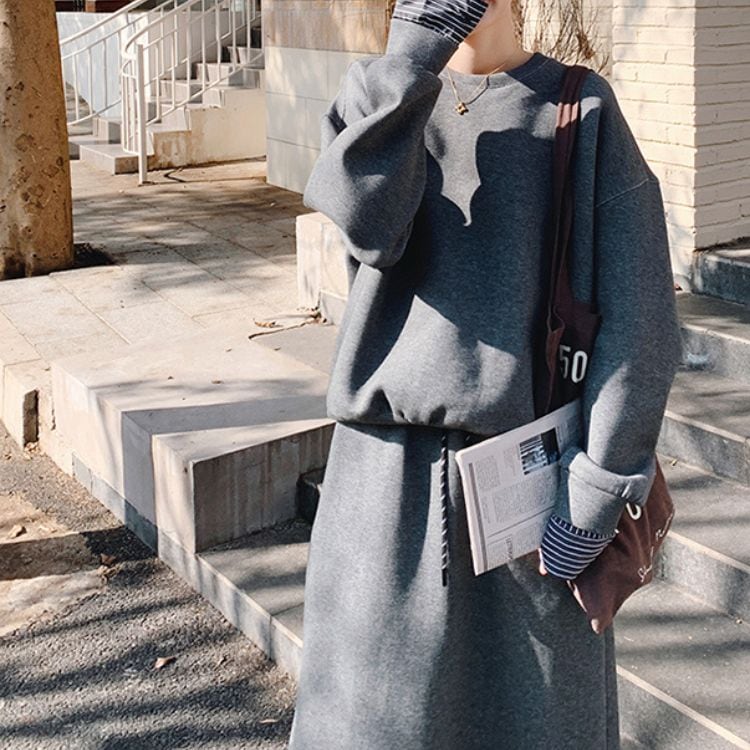 プルオーバーはゆったりとしたシルエットで、スカートも同様にリラックスした着心地を提供します。