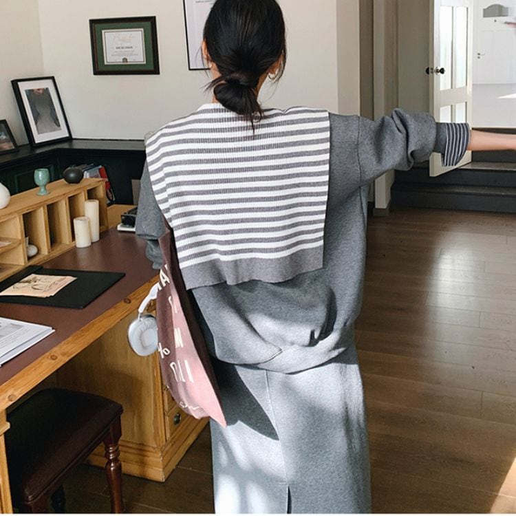 ストライプショール付きのリラックス3点セットは、プルオーバーとスカートのスウェットセットアップで、くつろぎながらもおしゃれを楽しむことができます。