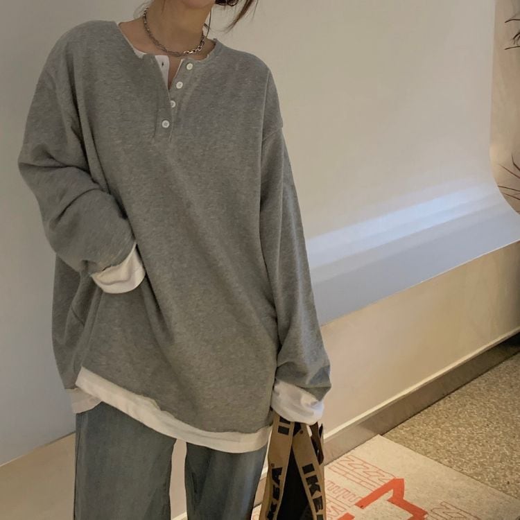 ヘンリーネックと重ね着風のデザインが、さりげなくおしゃれな着こなしを叶えます。