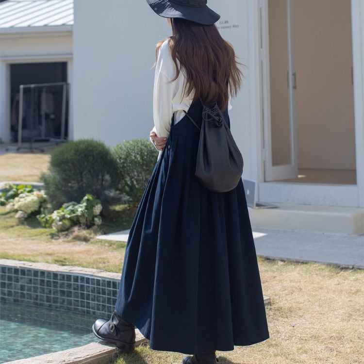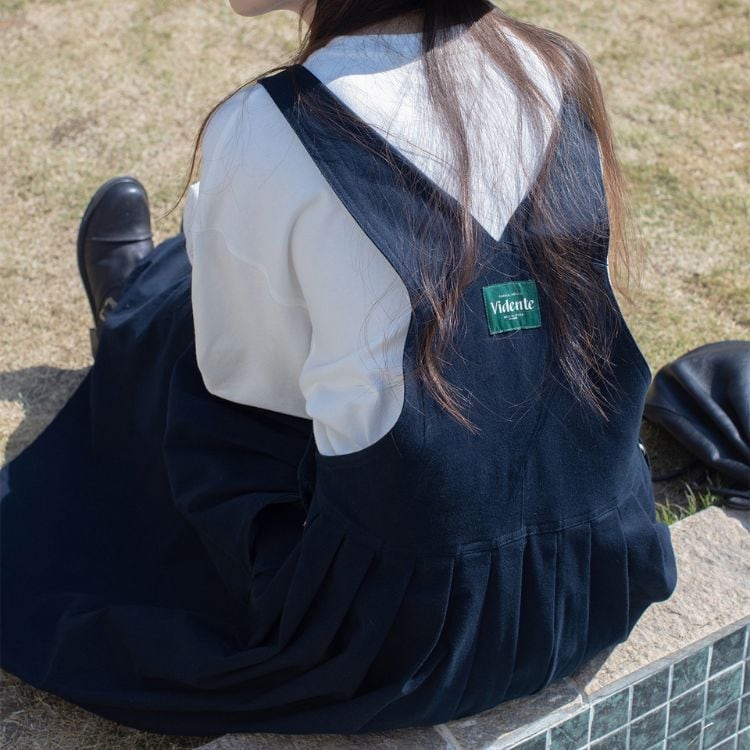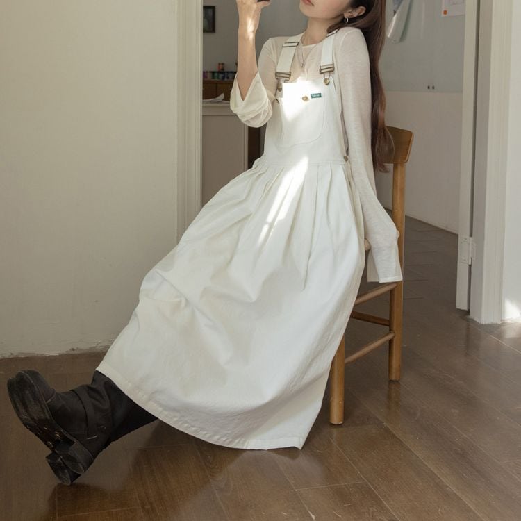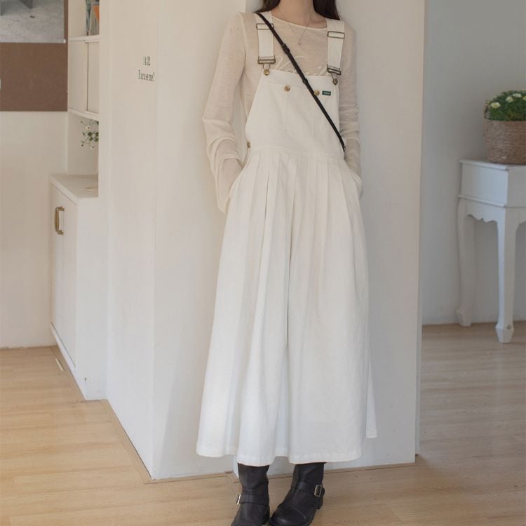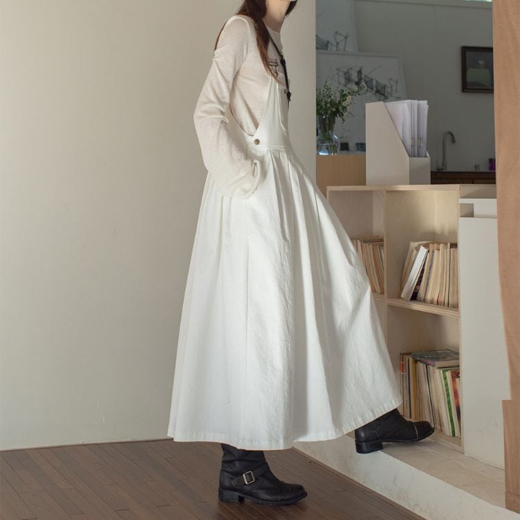 上品なフレアシルエットとタックプリーツが印象的なサロペットワンピース。