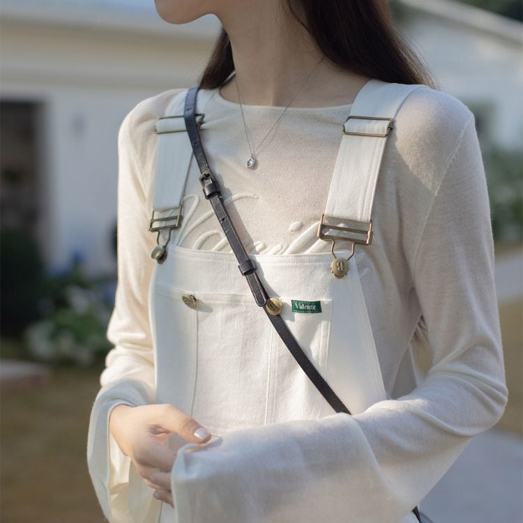 胸当てと太めのショルダーストラップでカジュアルさを残しつつ、