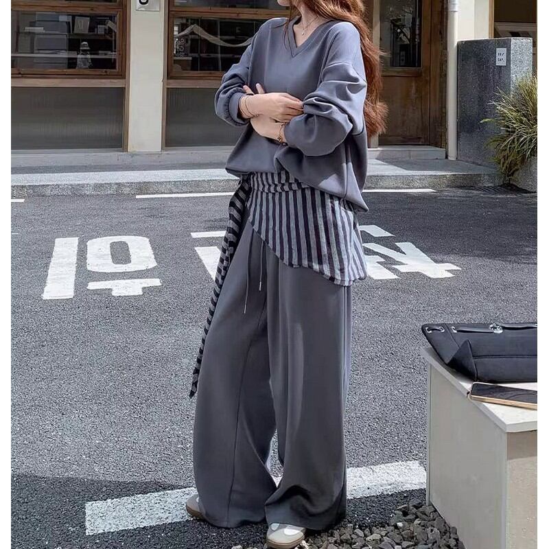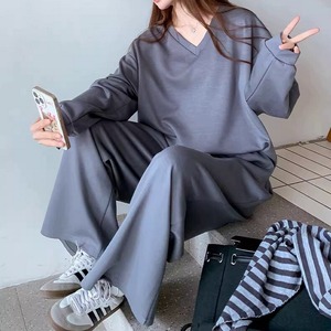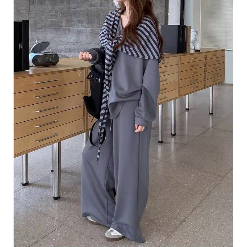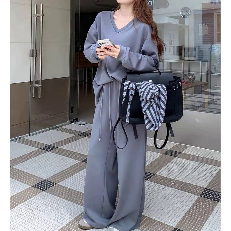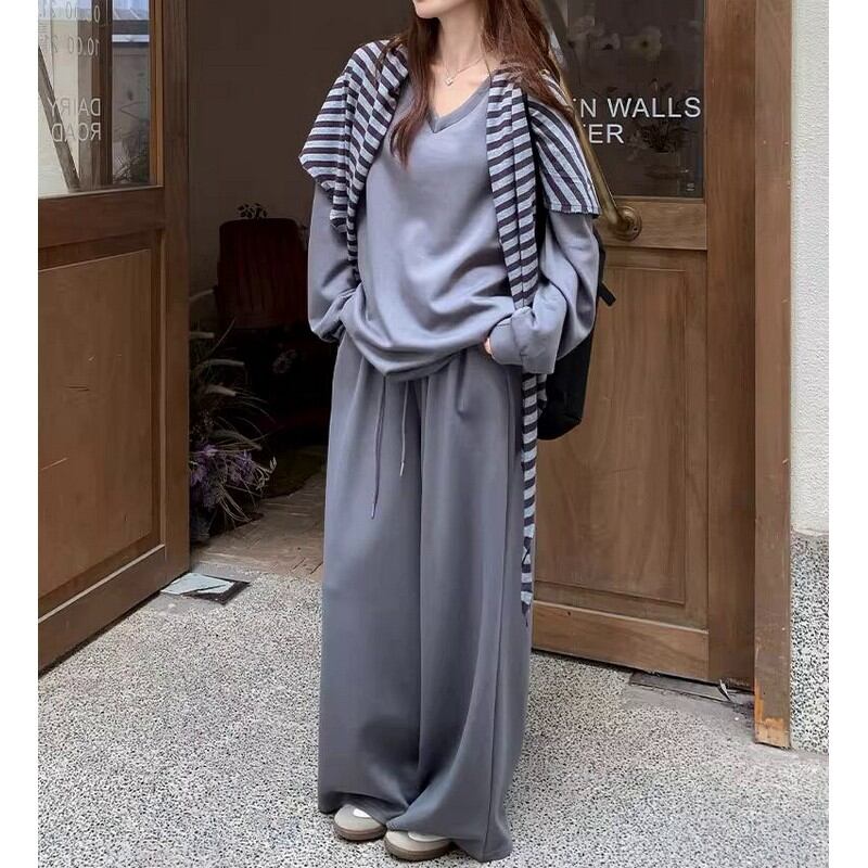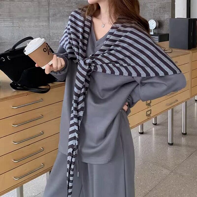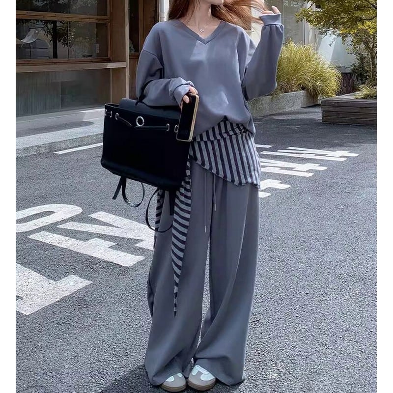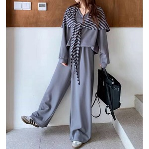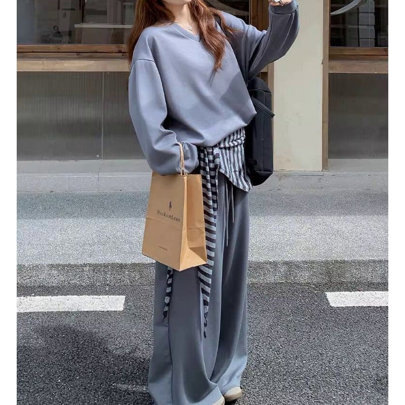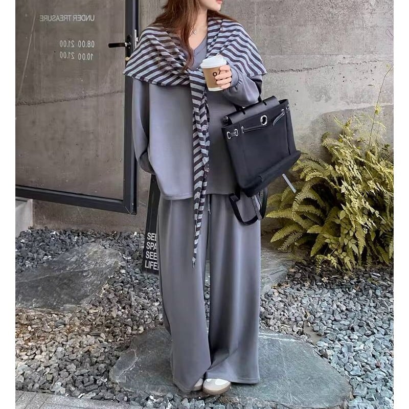 シンプルなVネックトップスとワイドパンツに、ボーダー柄のストールをプラスした3点セットです。