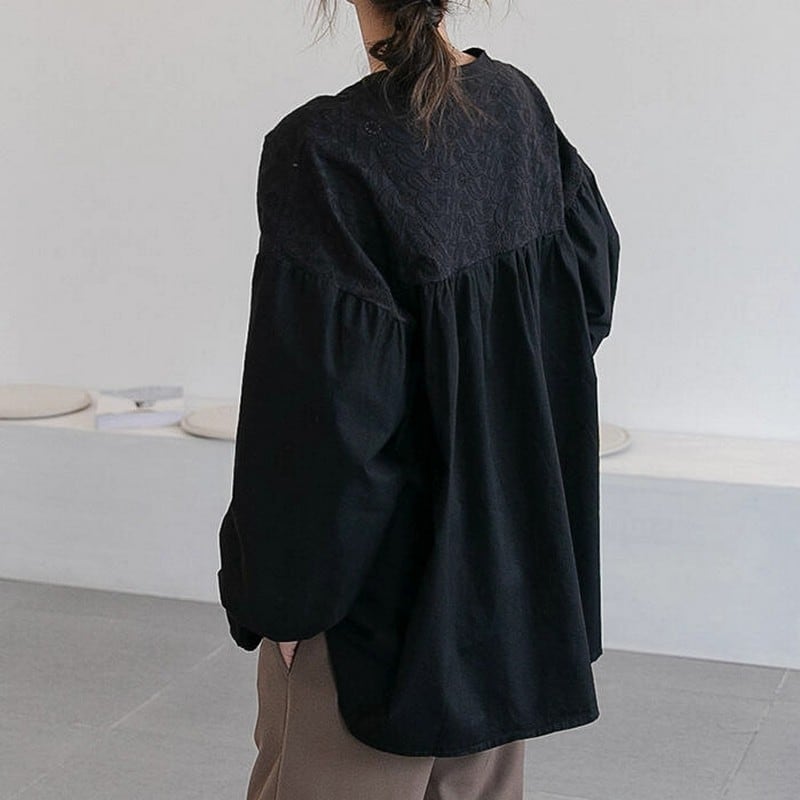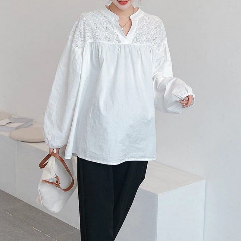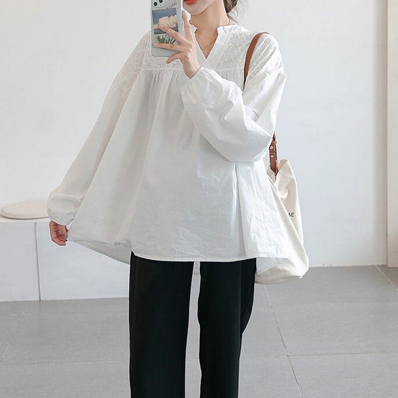 胸元のレース切り替えがやさしく映える、大人ナチュラルなコットンブラウス。