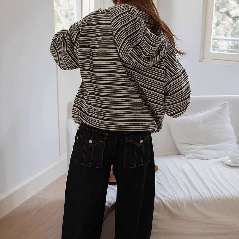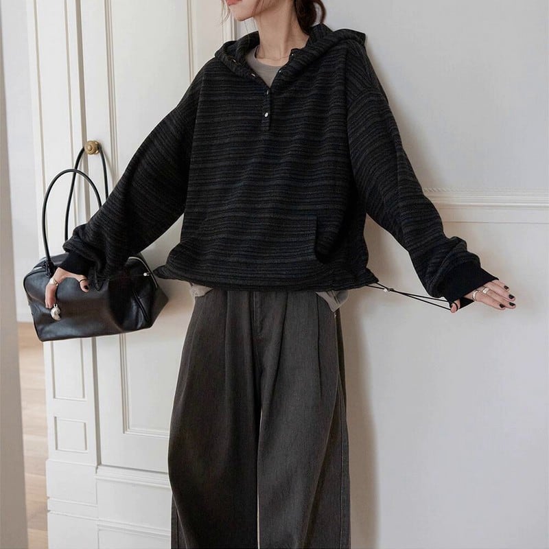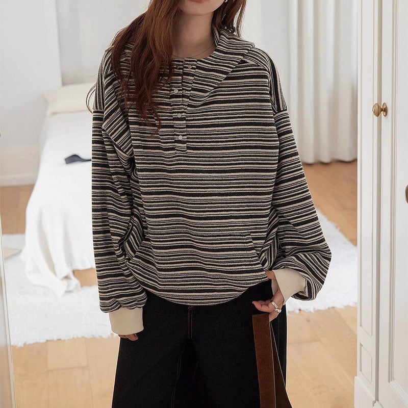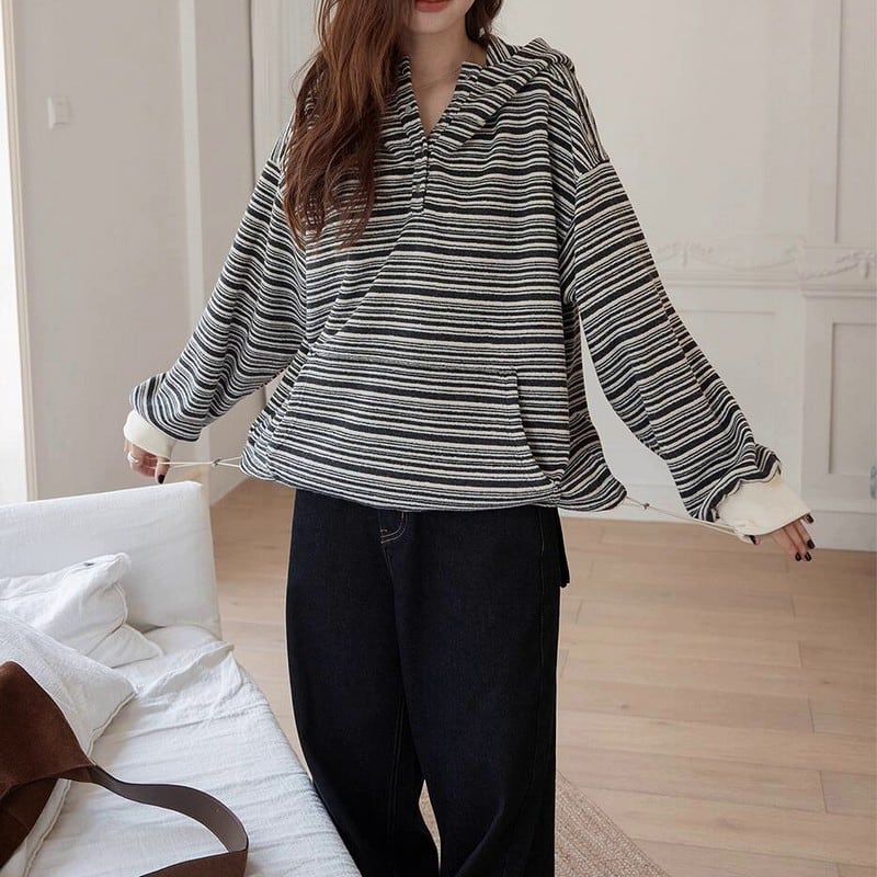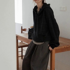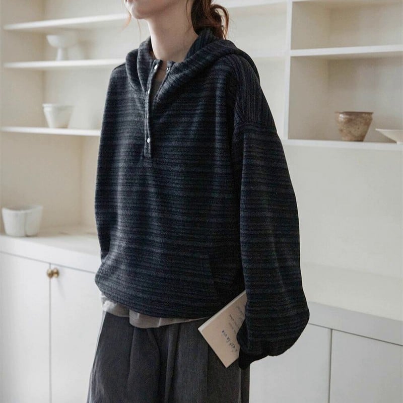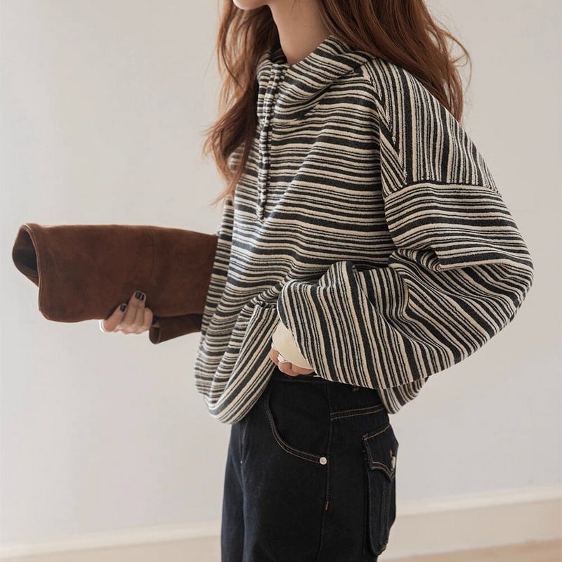 細めのストライプ柄が大人カジュアルに映えるハーフボタンプルオーバーです。