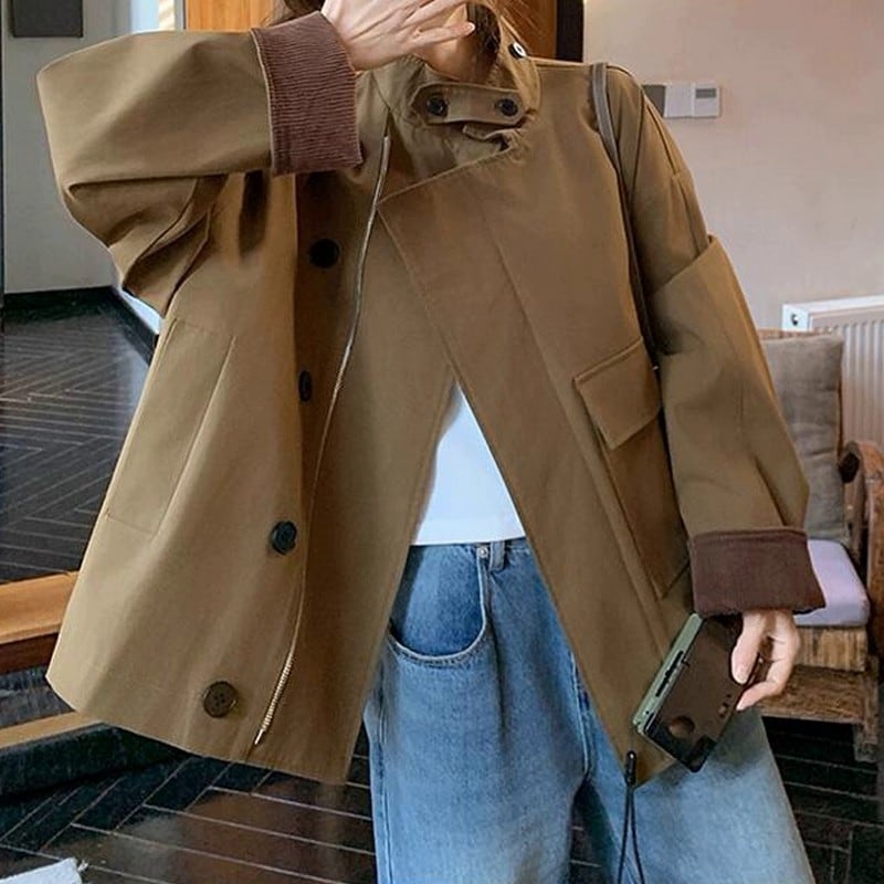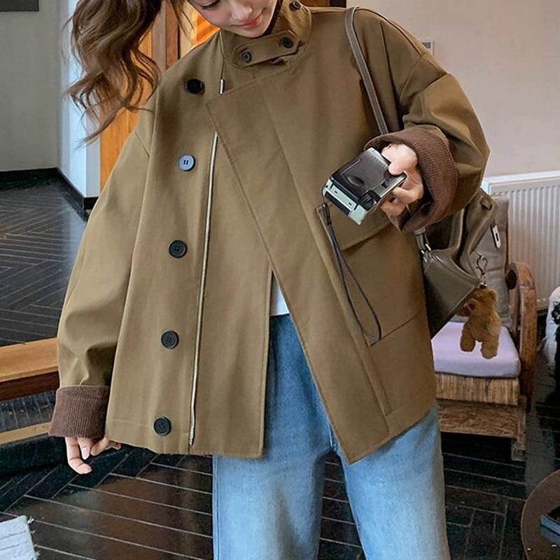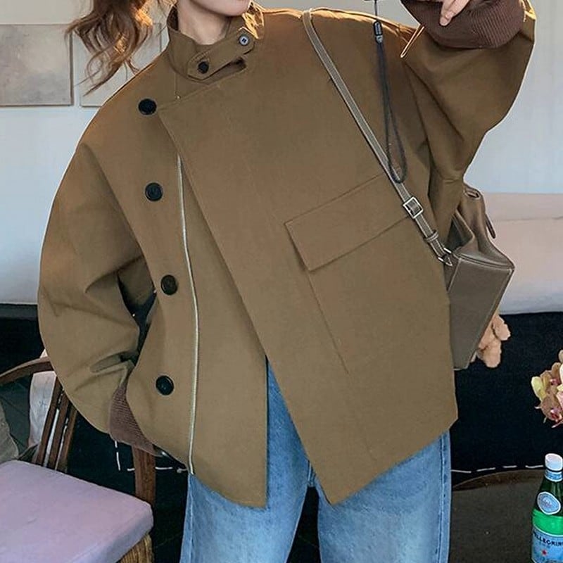 立体感のあるハイネックと大きめのボタンデザインがポイントで、羽織るだけでこなれた印象に仕上がります。