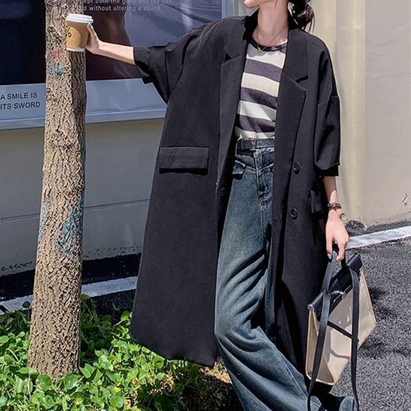 ゆったりとしたドロップショルダーに、ほどよい長さの着丈。