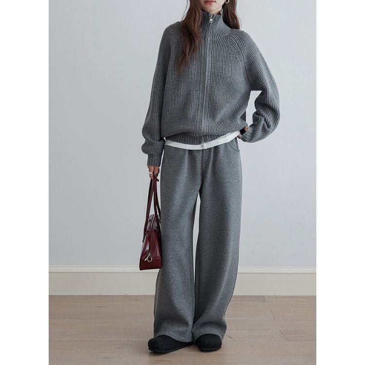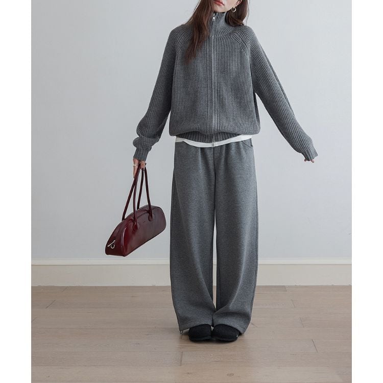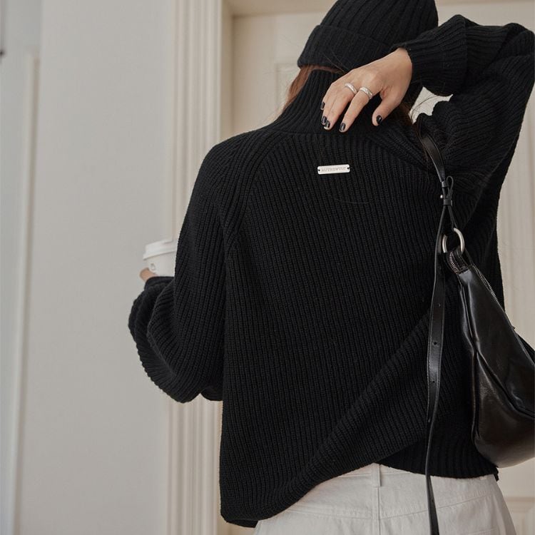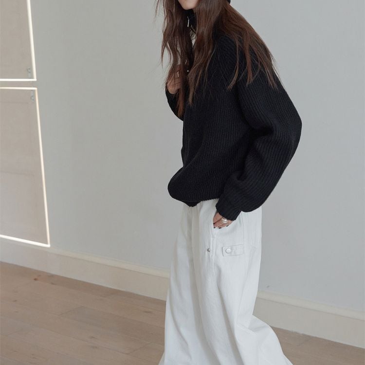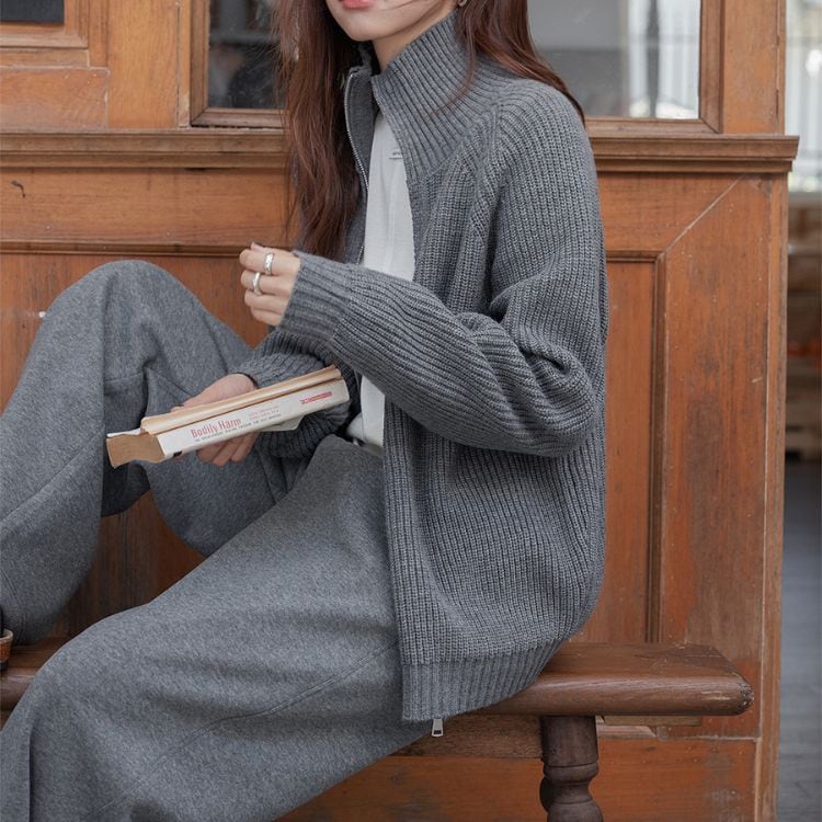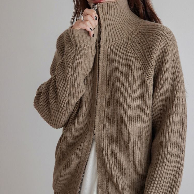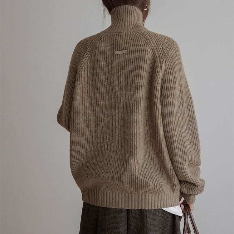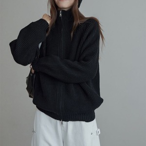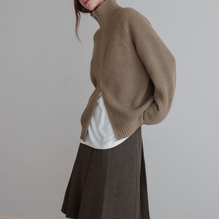 しっかりとしたリブ編みで仕立てたハイネックジップニット。