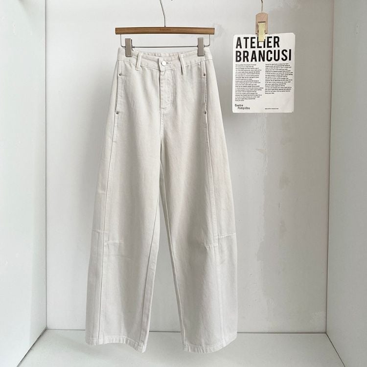 ステッチがアクセントになった、フルレングスのワイドレッグジーンズ。