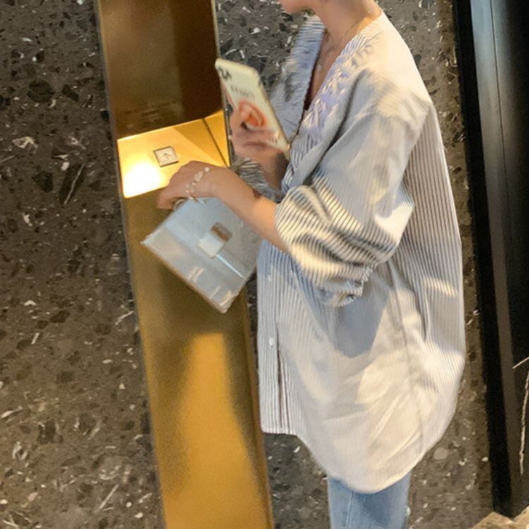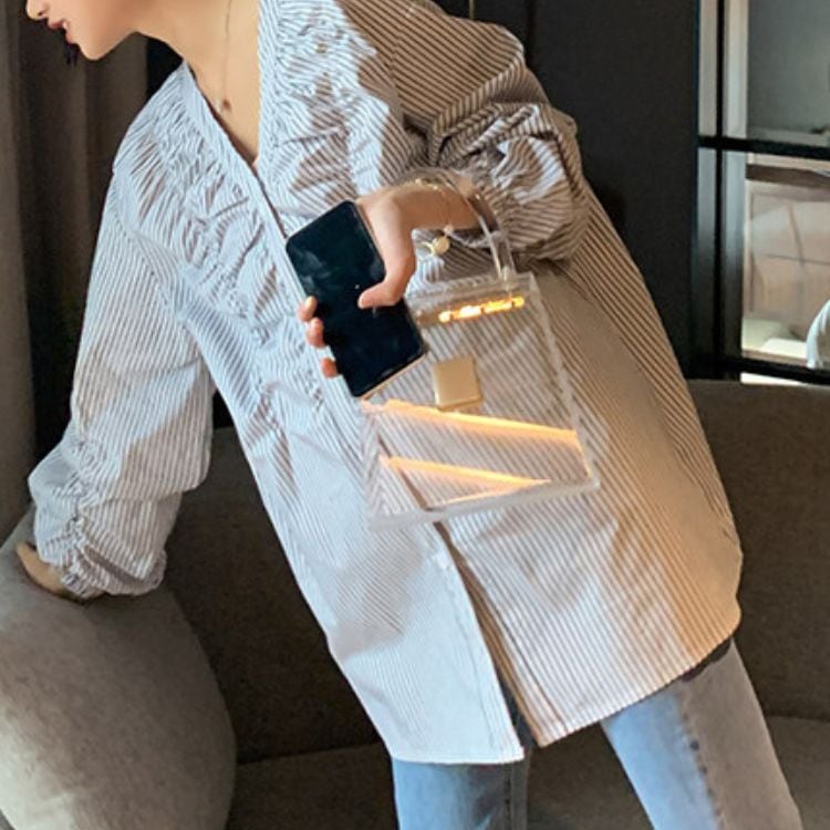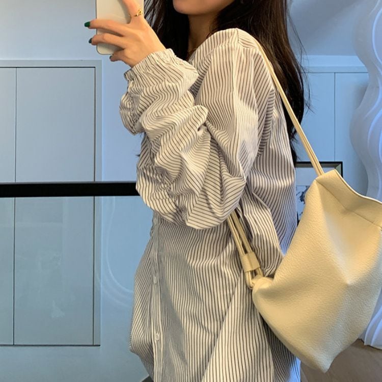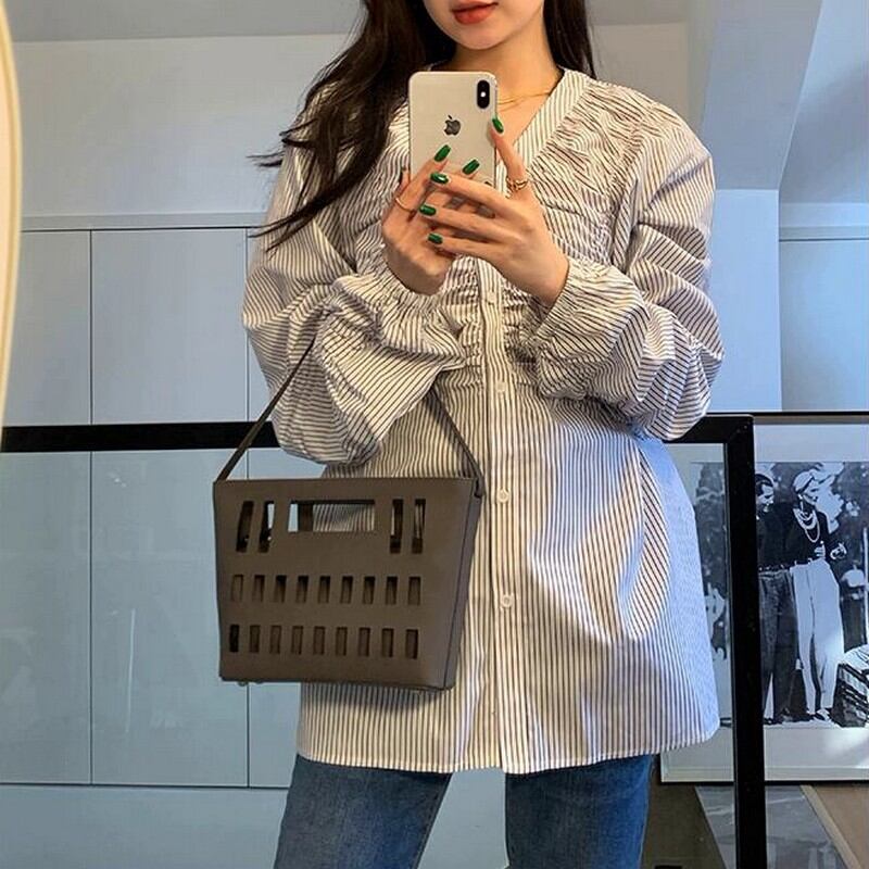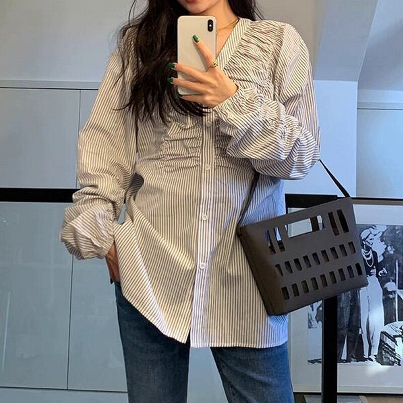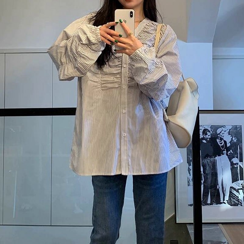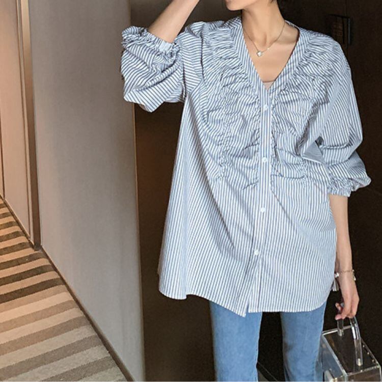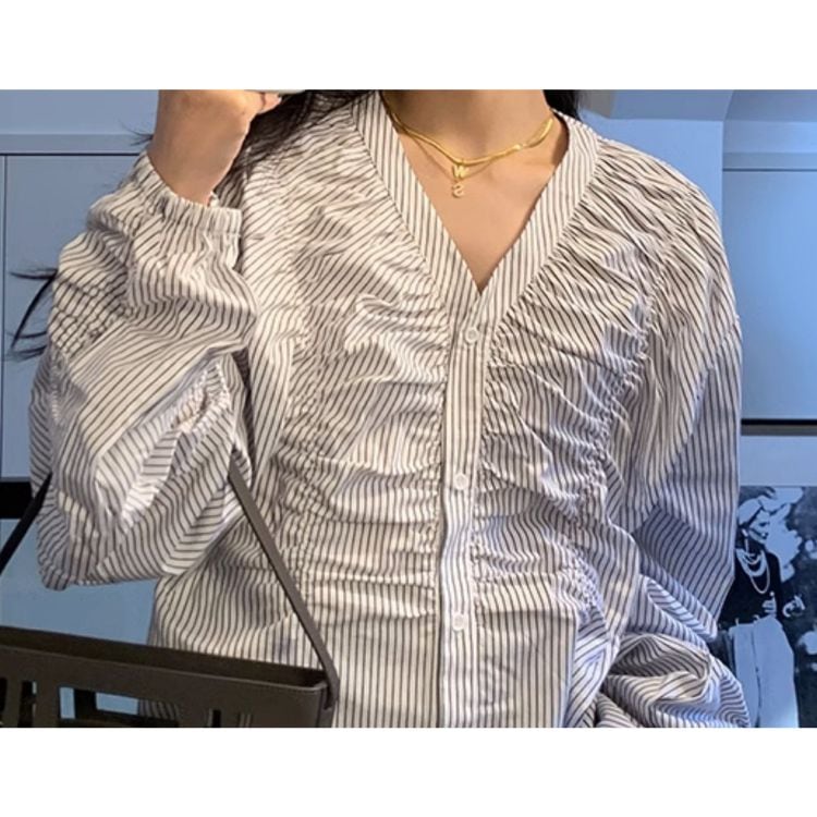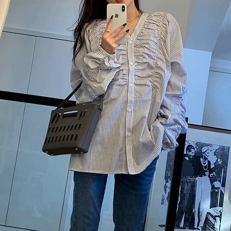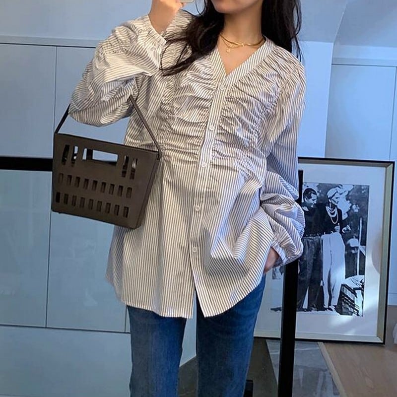縦ラインを強調するストライプ柄に、フロントのギャザーデザインを効かせたVネックブラウス。