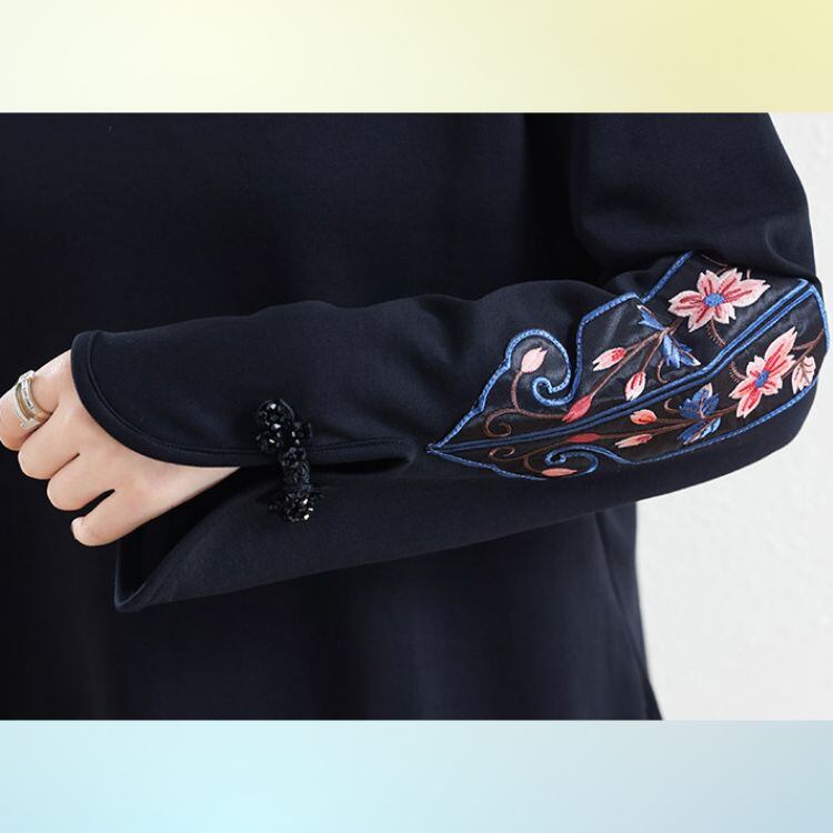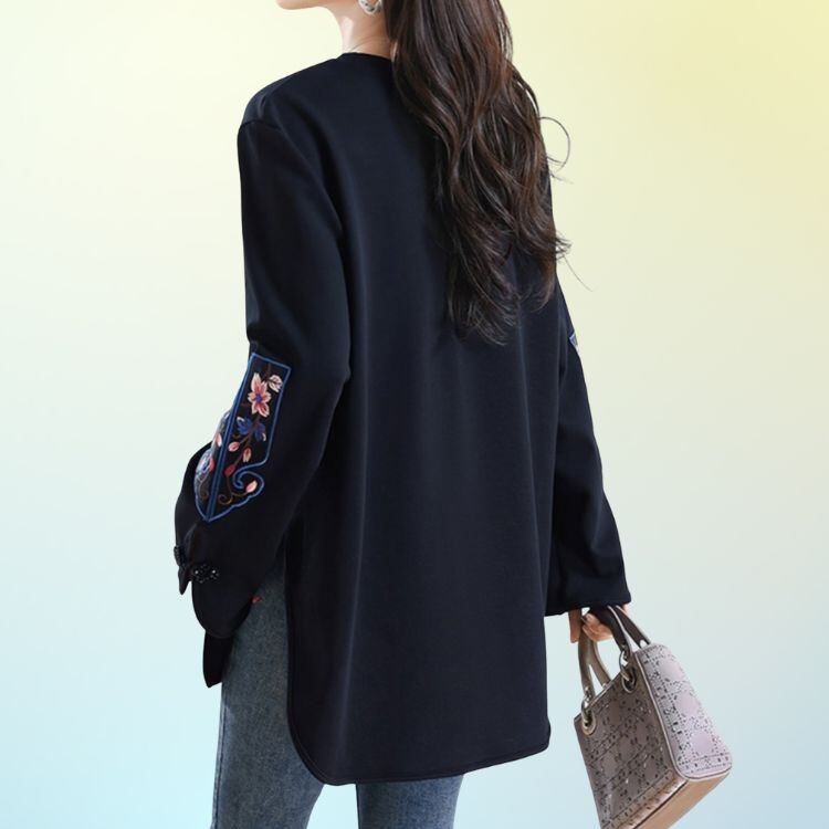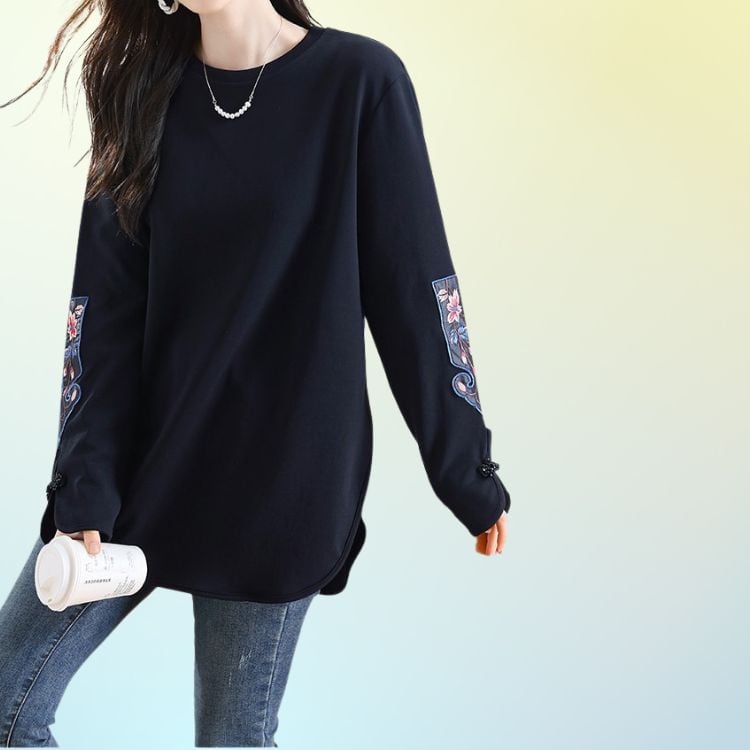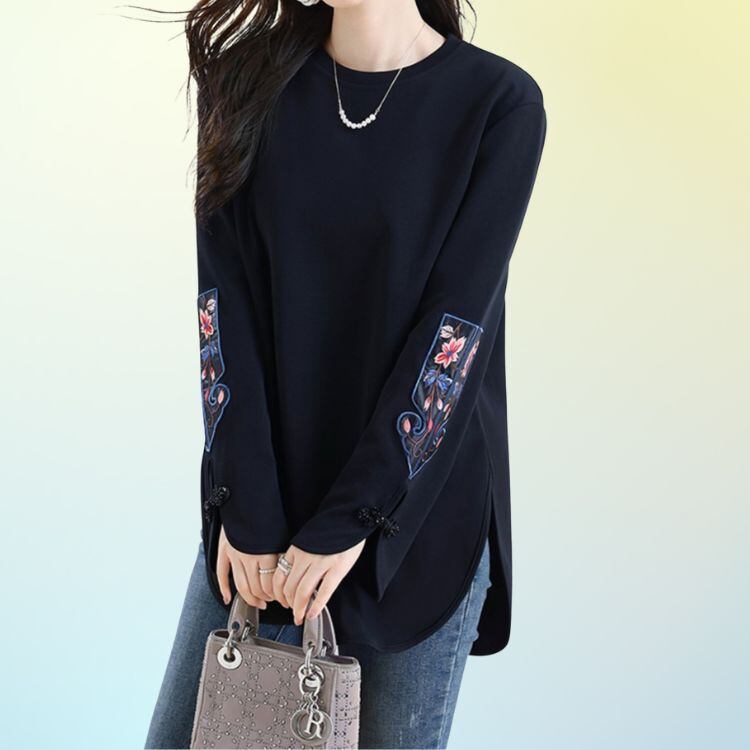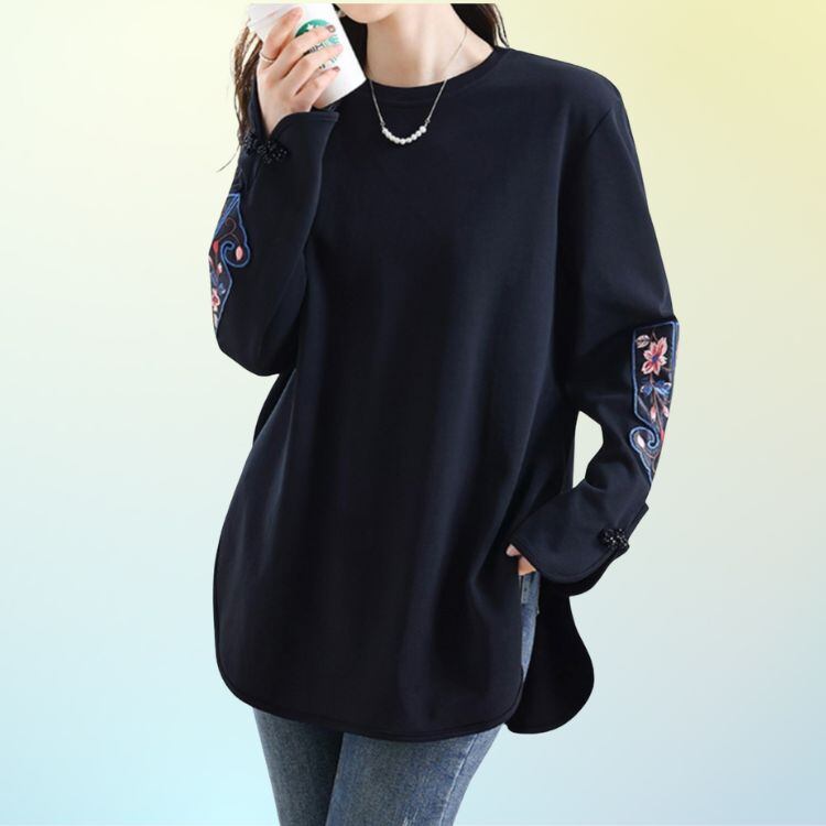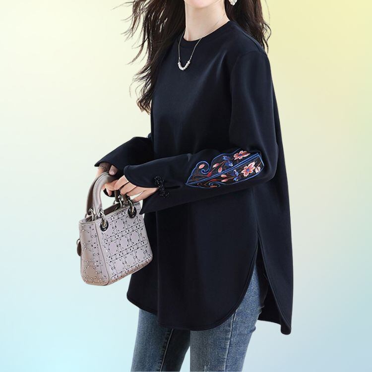 シンプルな身頃に、オリエンタルな雰囲気の刺繍袖が映えるデザインカットソー。