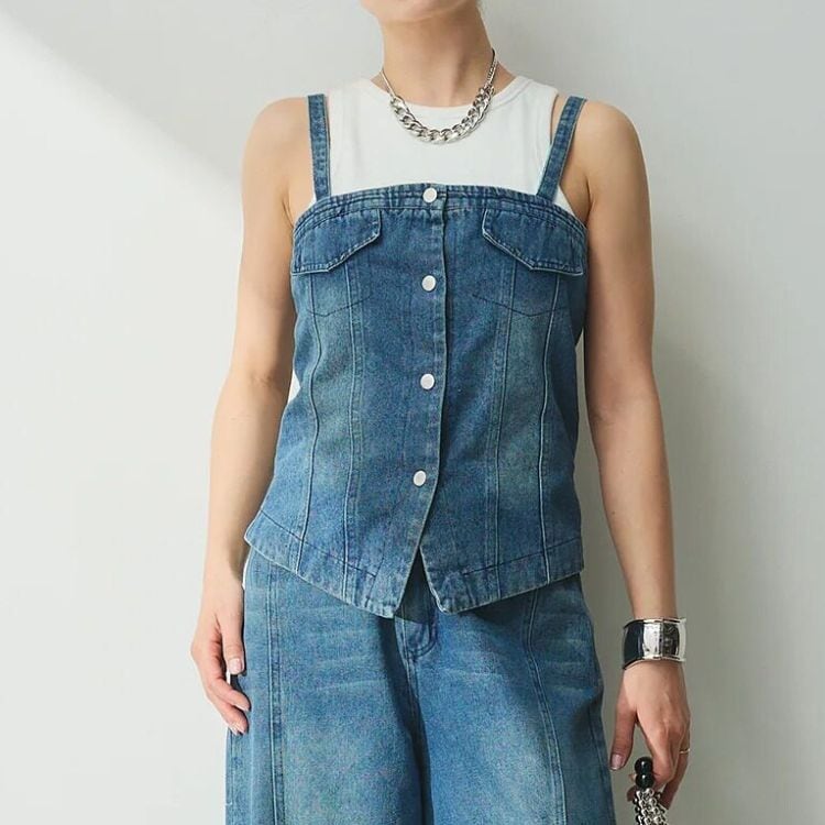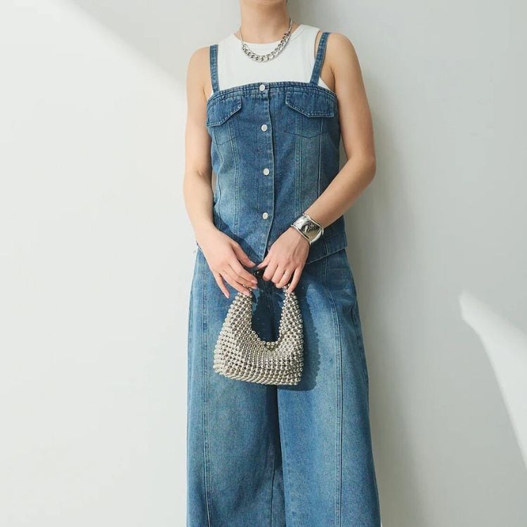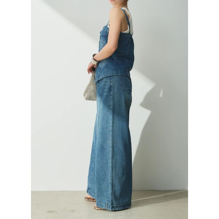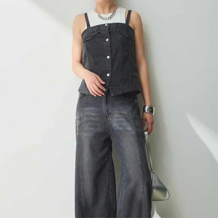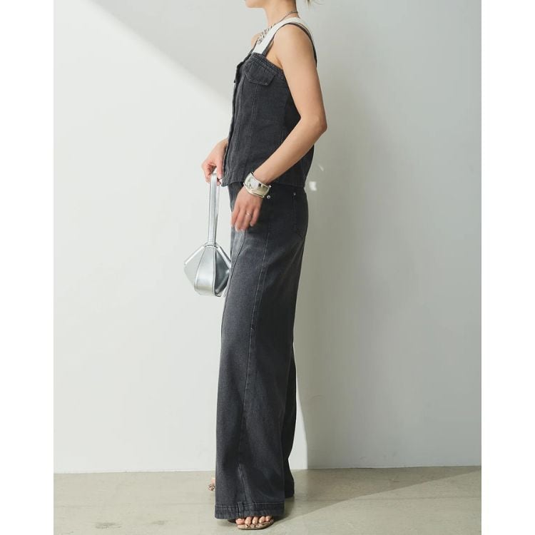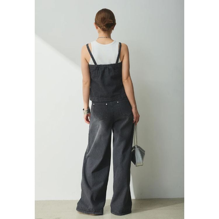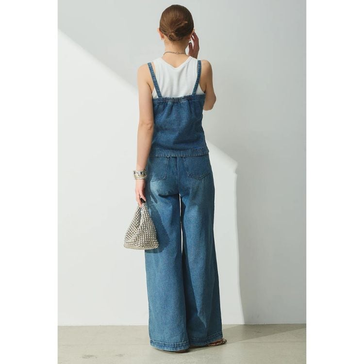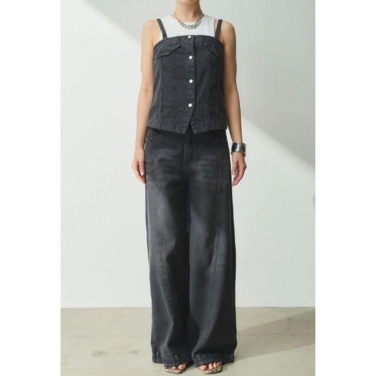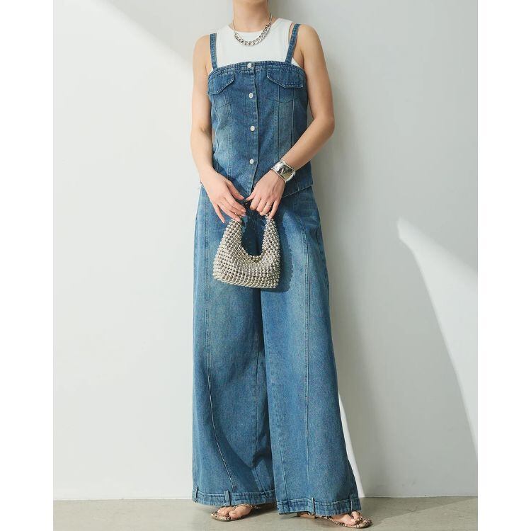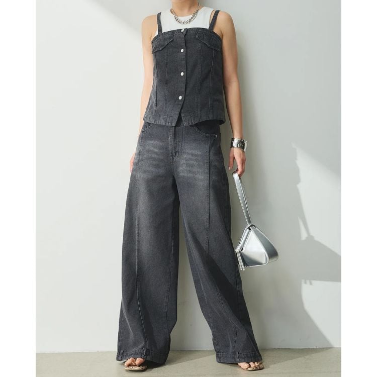 フロントボタンがアクセントのビスチェと、センターの切り替えデザインが特徴的なワイドパンツのセットアップです。